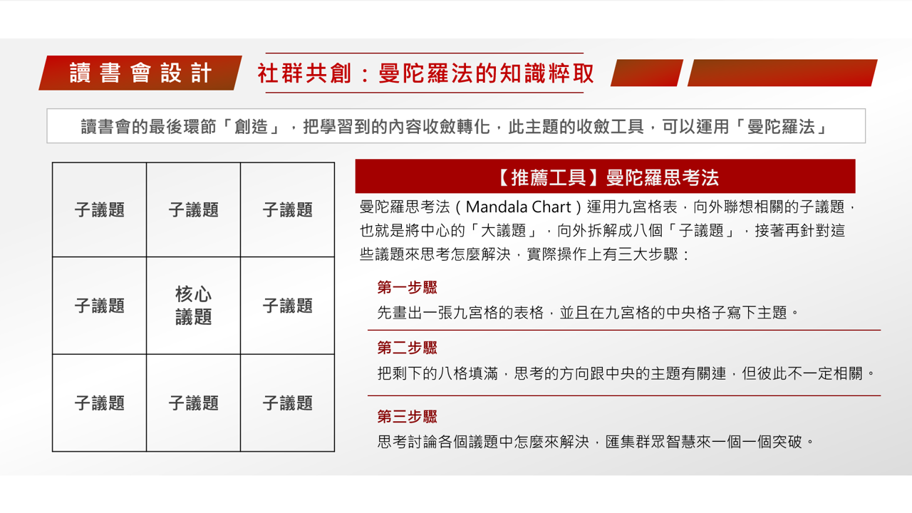 讀書會的最後環節「創造」,把學習到的內容進行收斂。我們分享社群引導術中的一種收斂工具「曼陀羅法」。